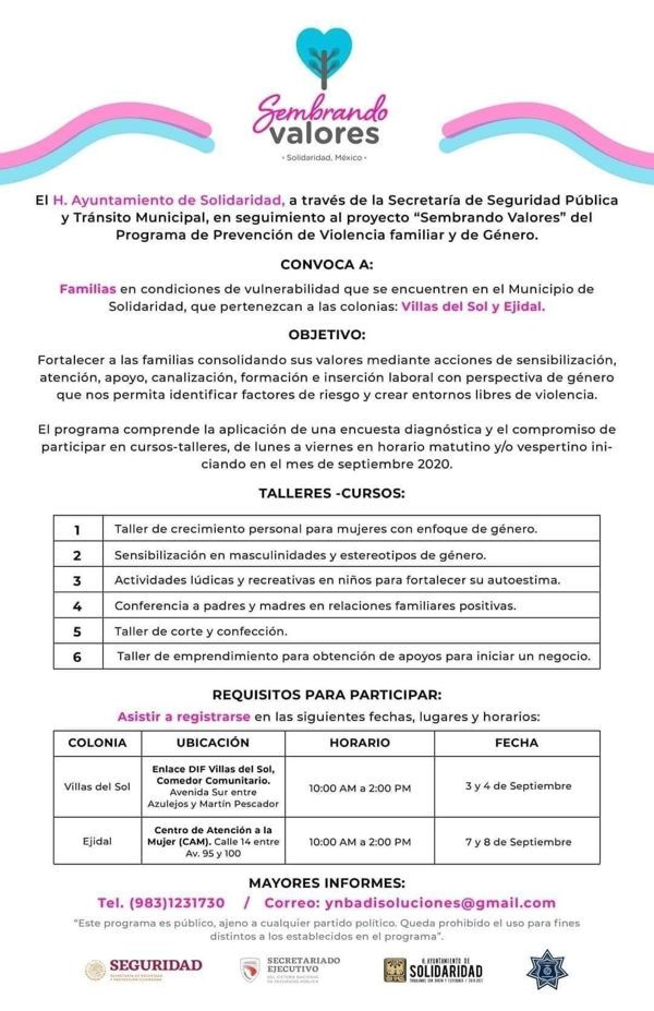 El H. Ayuntamiento de Solidaridad, a través de la Secretaria de Seguridad Pública y Tránsito Municipal, en seguimiento al proyecto “Sembrando Valores” del Programa de Prevención de Violencia familiar y de Género.