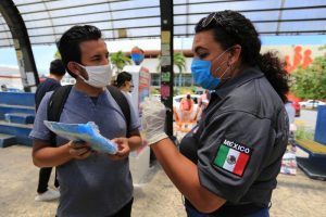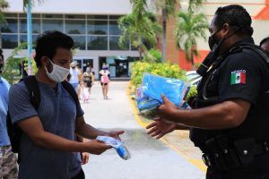 Entrega, Gobierno de Solidaridad, kits sanitizantes a turistas y locales que ingresan a la ciudad en el acceso Playa-Cancún y paraderos de transporte, para recordar no bajar la guardia y continuar medidas de prevención contra el COVID19.
