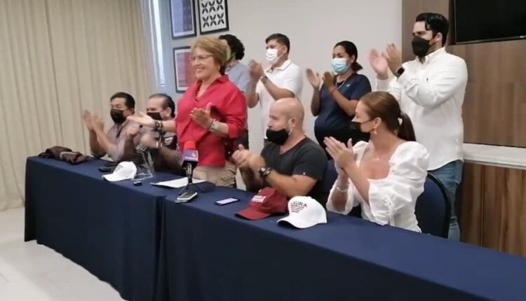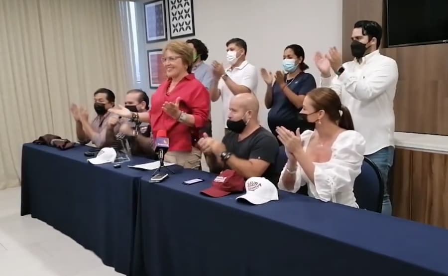 La presidenta municipal de Solidaridad Laura Beristain, acompañada de integrantes de su planilla anunció en conferencia de prensa la tarde de este 6 de junio una ventaja de 4% sobre el candidato más cercano.