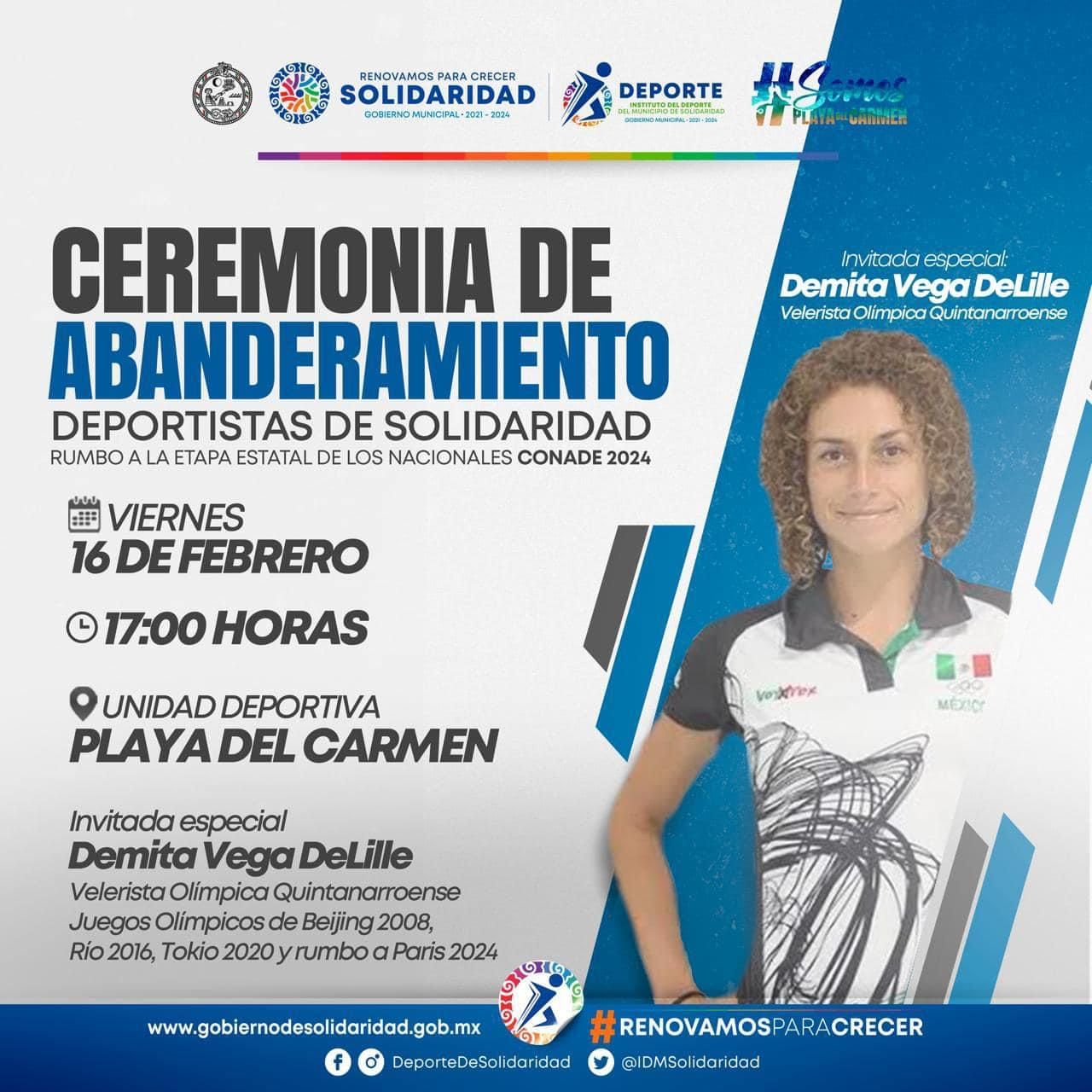 Playa del Carmen, Solidaridad, Q. Roo a 15 de febrero de 2024.- Deportistas solidarenses recibirán los uniformes qué portarán en la etapa Estatal de los Nacionales CONADE 2024, por lo que el viernes 16 de febrero a las cinco de la tarde se realizará la ceremonia de abanderamiento, estará encabezada por la presidenta municipal Lili Campos y como invitada especial a la velerista olímpica quintanarroense Demita Vega, en el gimnasio Poliforum de la unidad deportiva Playa del Carmen.