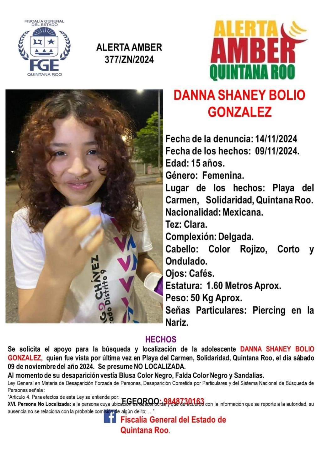 La Fiscalía General del Estado de Quintana Roo (FGE) ha activado una alerta de búsqueda para Danna Shaney Bolio González, una adolescente de quince años que fue vista por última vez el 9 de noviembre de 2024 en el municipio de Solidaridad, Quintana Roo. Las autoridades solicitan el apoyo de la ciudadanía para localizarla, ya que actualmente se desconoce su paradero.