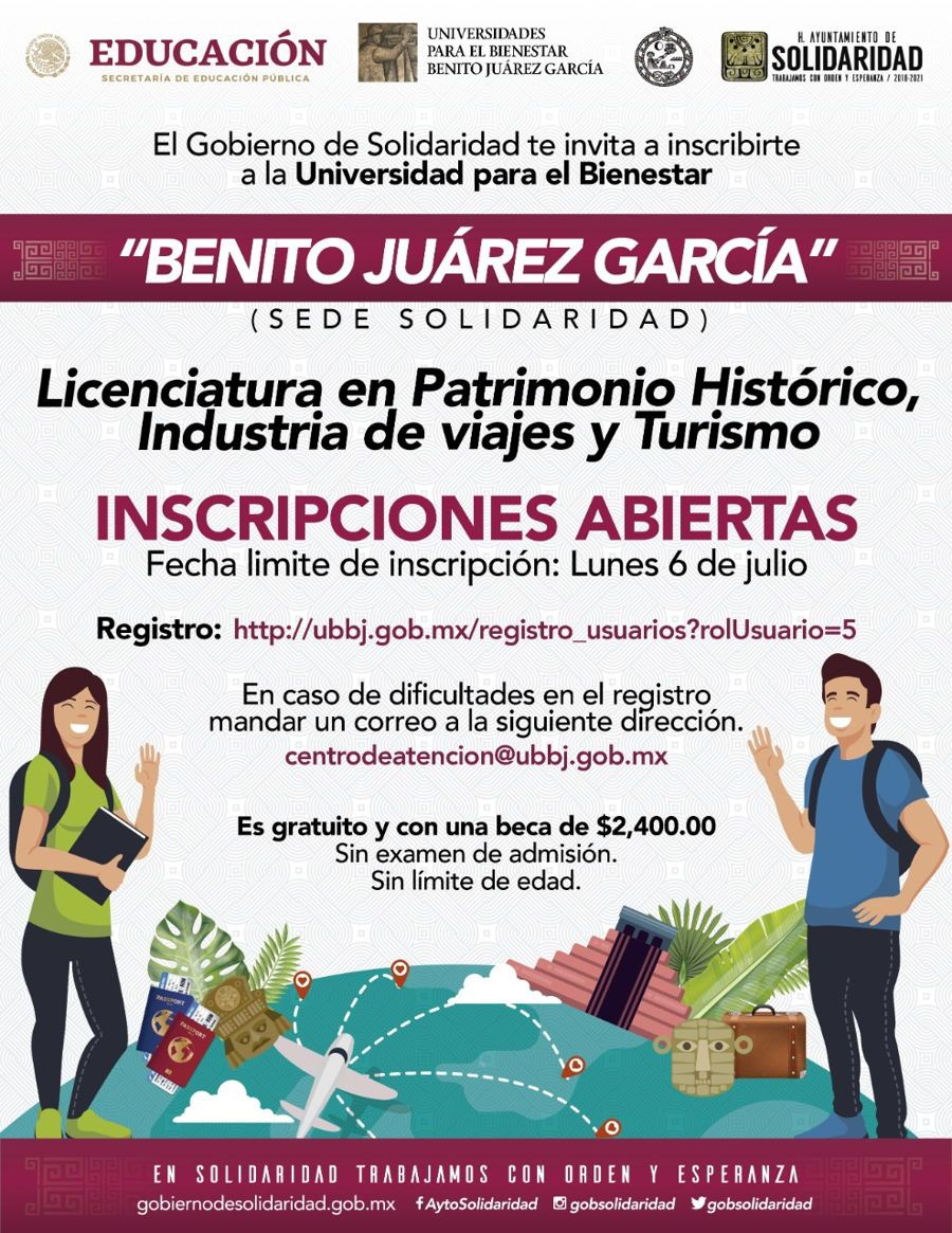 Abre inscripciones la Universidad para el Bienestar “Benito Juárez García” (UBBJ), sede Solidaridad con la licenciatura en “Patrimonio Histórico, industria de viajes y turismo”, para jóvenes y adultos que no pudieron terminar sus estudios profesionales.