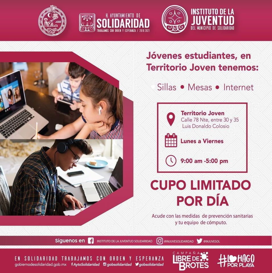 El Gobierno de Solidaridad que dirige Laura Beristain Navarrete, brinda este servicio en un horario de 9 de la mañana a 5 de la tarde de lunes a viernes, con la finalidad de que puedan tomar clases virtuales en el Centro Territorio Joven y Ciudad Juventud, en Playa del Carmen, así como en las oficinas de Enlace en Puerto Aventuras.