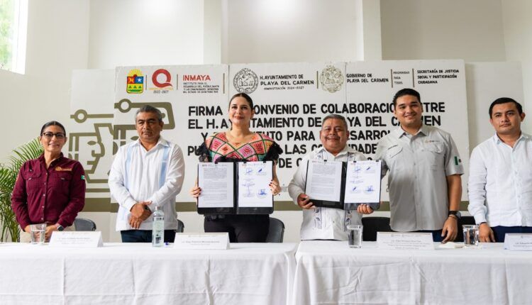 Playa del Carmen, Quintana Roo, 11 de agosto de 2025.— La presidenta municipal Estefanía Mercado encabezó esta mañana la firma del convenio de colaboración entre el Ayuntamiento de Playa del Carmen y el Instituto para el Desarrollo del Pueblo Maya y las Comunidades Indígenas de Quintana Roo (INMAYA), representado por Eder Chuc Cen.