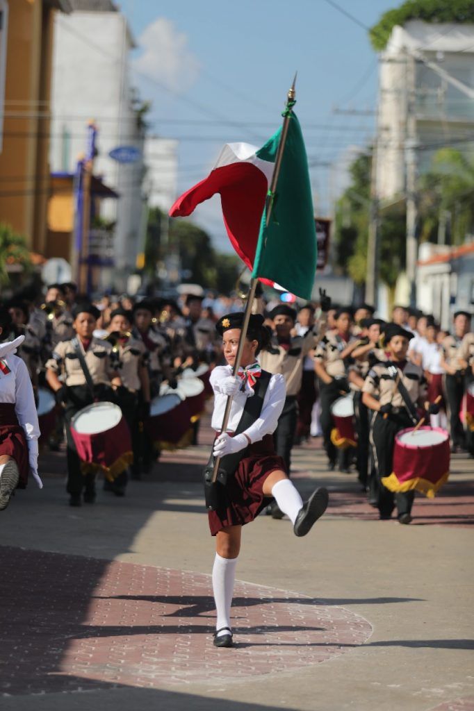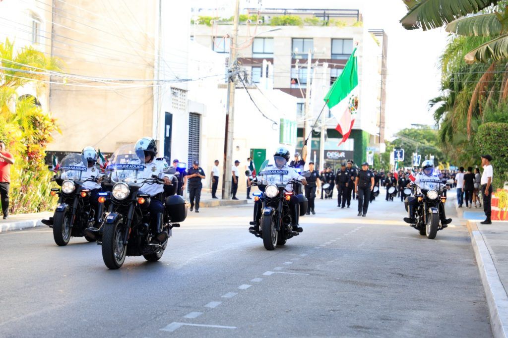 La presidenta municipal, acompañada por los integrantes del Cabildo, miembros de su gabinete, así como invitados especiales, entre ellos los representantes de la Secretaría de la Defensa Nacional, la Marina, la Guardia Nacional, la Policía Federal y Estatal, saludaban a los participantes, quienes desde temprana horas del día se dieron cita en la unidad deportiva Mario Villanueva para realizar el tradicional desfile que culminó frente al palacio municipal.