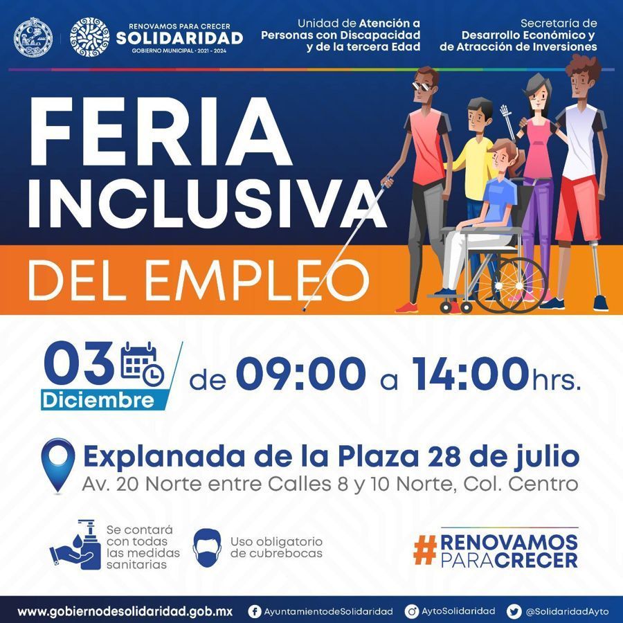 Como parte de su agenda de gobierno, Lili Campos Miranda, presidenta municipal de Solidaridad, ha dispuesto fomentar la inclusión en el municipio, por lo que la Unidad de Atención a Personas con Discapacidad y de la Tercera Edad, en coordinación con la Secretaría de Desarrollo Económico y de Atracción de Inversiones y la Secretaría de Justicia Social y Participación Ciudadana, realizará la Feria Inclusiva del Empleo para promover vacantes para personas con discapacidad y de la tercera edad.