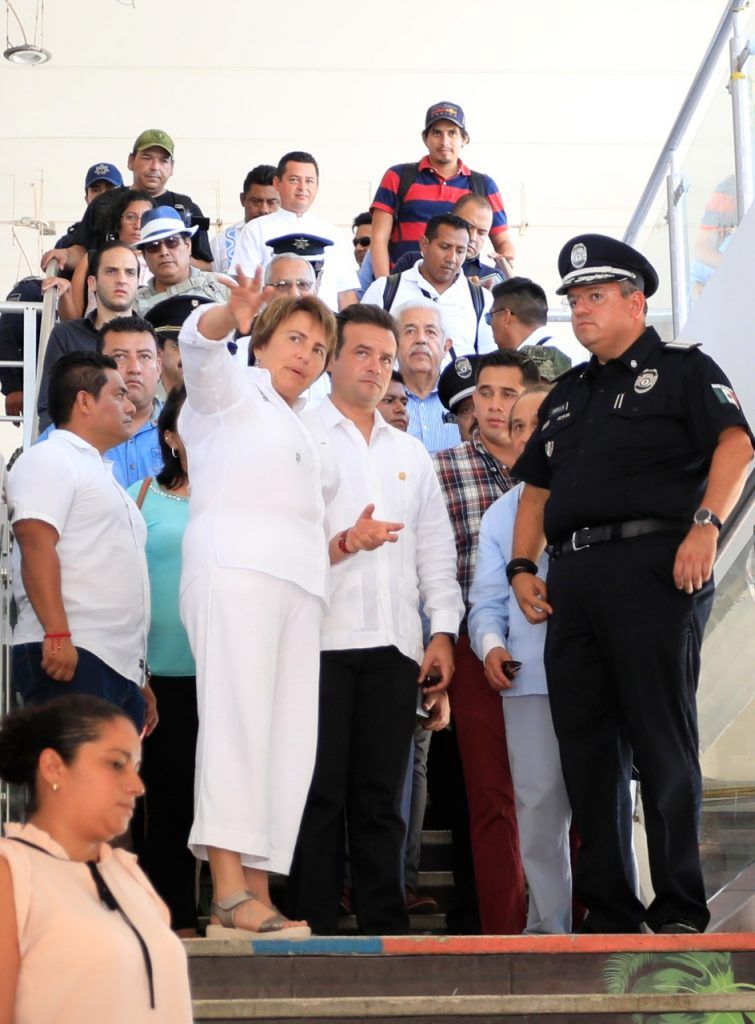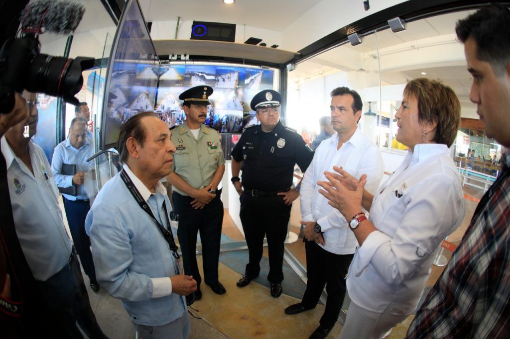 La presidenta municipal, Laura Beristain Navarrete, recorrió junto al alcalde de Cozumel, Pedro Joaquín Delbouis, el titular de Seguridad Pública de Quintana Roo, Alberto Capella Ibarra; autoridades militares, policiales y portuarias, la zona turística de Playa del Carmen –en los alrededores del muelle fiscal- en atención a la seguridad y movilización coordinada entre destinos turísticos.