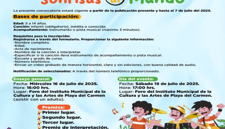 Playa del Carmen, Quintana Roo, 11 de junio de 2025.- El Instituto Municipal de la Cultura y las Artes, invita a niñas y niños de 5 a 14 años de edad, a participar en “Sonrisas al Mundo”, el primer Festival de Música Infantil que se desarrollará en Playa del Carmen.