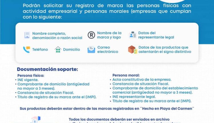 Entre los requisitos están que todos los productos deben pertenecer a las categorías de marcas registradas en “Hecho en Playa del Carmen”, además deberán cubrir la tarifa establecida por el Instituto Mexicano de la Propiedad Intelectual, entre otros.