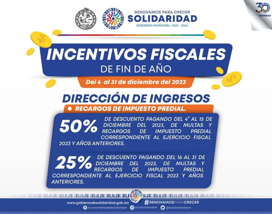 Dichos incentivos de la Dirección de Ingresos contemplan un 50% de descuento, pagando hasta el 15 de diciembre, en multas y recargos de impuesto predial correspondiente al ejercicio fiscal 2023 y años anteriores y un 25% de descuento pagando del 16 al 31 de diciembre.