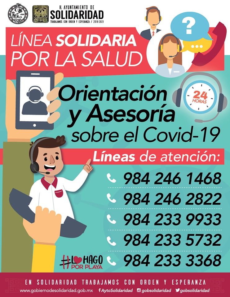 La presidenta municipal de Solidaridad Laura Beristain Navarrete anunció que giró instrucciones para que las personas que hayan sido despedidas por la contingencia del COVID-19 reciban asesoría legal gratuita en caso de que la necesiten; el procedimiento será a través de los números de atención telefónica 984 246 1468; 984 246 2822;984 233 9933; 984 233 5732; 984 233 3368.