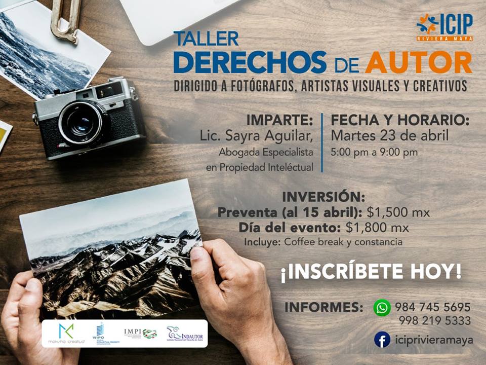 El Instituto de Competitividad Integral Profesional de la Riviera Maya, invita al taller sobre Derechos de Autor que se llevará a cabo el martes 23 de abril y será impartido por la Lic. Sayra Aguilar abogada especialista en propiedad intelectual.