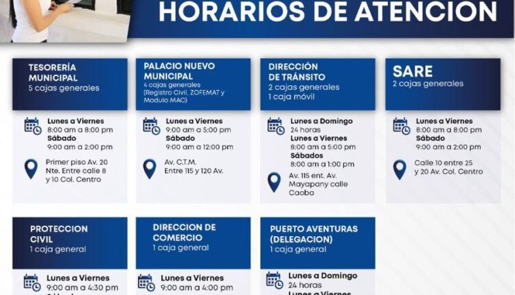 Para facilitar el acceso a las cajas recaudadoras, el ayuntamiento abrió varios puntos, en horario de oficina, entre ellos: Tesorería municipal, palacio nuevo, Protección Civil (avenida Tecnológico casi esquina con avenida 115), Dirección de Comercio (1ra. Sur con calle 20, colonia Centro), Dirección de Tránsito, alcaldía de Puerto Aventuras y en las oficinas de SARE que están a un costado del antiguo palacio municipal sobre calle 10.