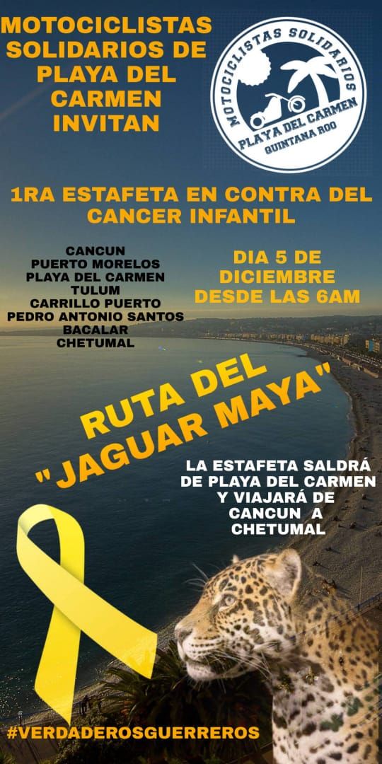 Street bikers Playa del Carmen y la Unión de motociclistas solidarios invita a todos los bikers de la región a la caravana “Rodada del Jaguar maya” que se llevará a cabo el 5 de diciembre a partir de las 6:00 am, saliendo desde playa del carmen y se dirigirá hacia el área de oncología infantil del hospital regional de Chetumal