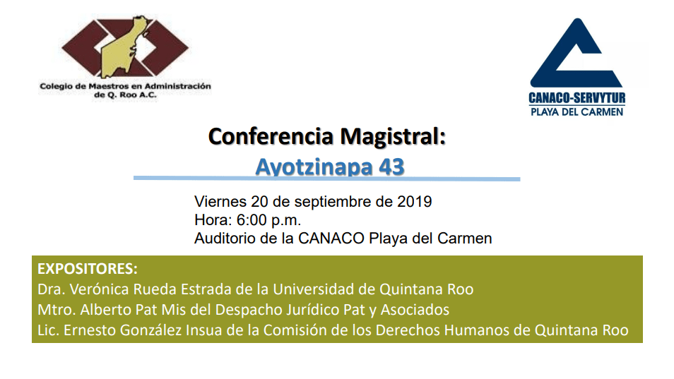 El Colegio de Maestros en Administración, y la Canaco-Servytur invitan a la conferencia magistral “Ayotzinapa 43”, este viernes 20 de septiembre de 2019 a las 6:00 p.m.