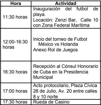 La inauguración del evento será a las 11:30 hrs. en la calle 10 y la playa para dar inicio al torneo de futbol playero y posteriormente a partir de las cinco de la tarde, eventos culturales que incluirán presentación de ensambles, la participación de la cantante Alina Campos, música de salsa cubana con bailarines participando y la premiación del torneo de futbol que será a las 20:30 hrs en el restaurante La bodeguita del medio.