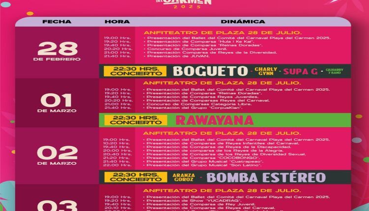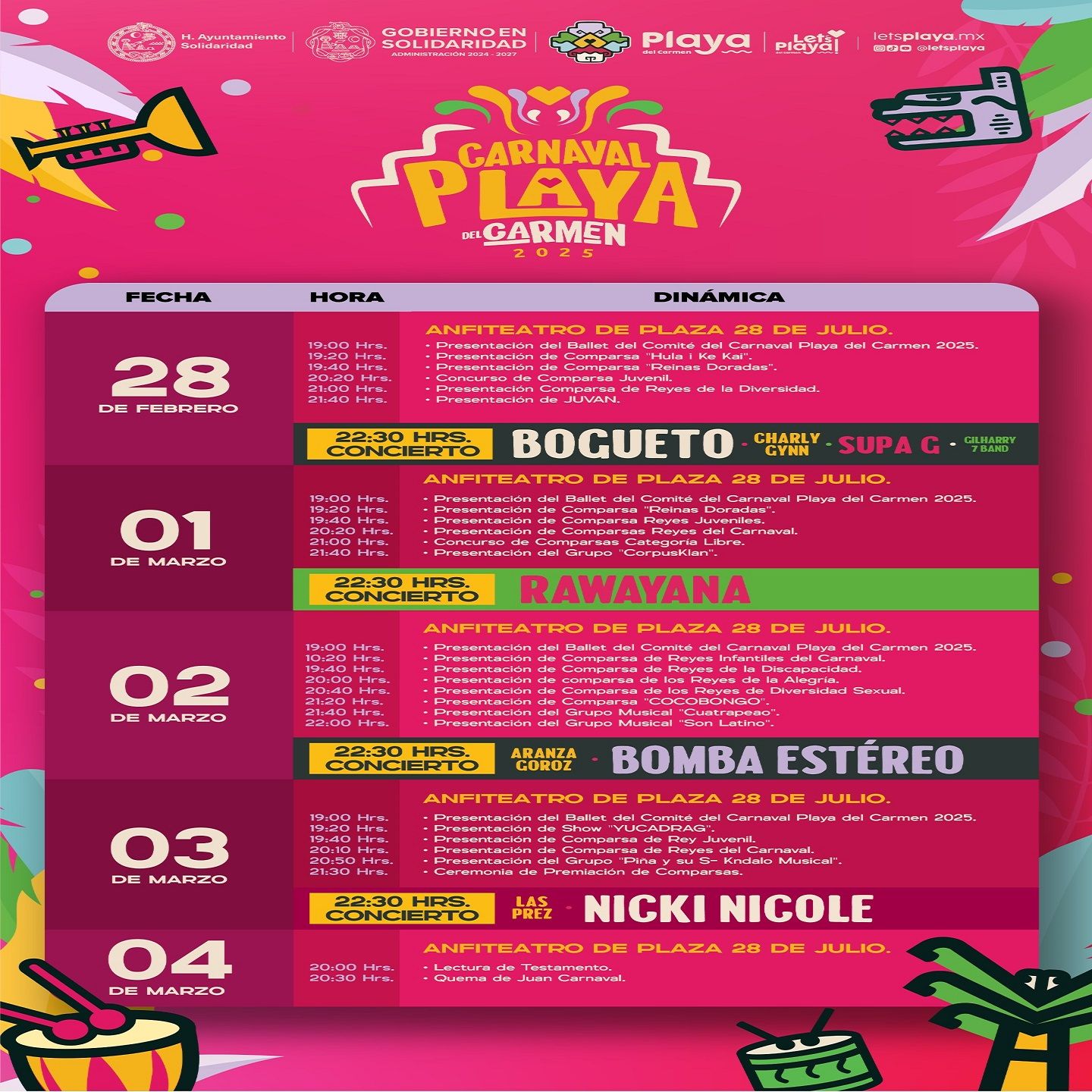 La cartelera de actividades arrancará ese día a las 7 de la noche, con la presentación del Ballet del Comité de Carnaval de Playa del Carmen 2025 y la despedida de los Reyes del Carnaval 2024. Más tarde, los reyes del carnaval 2025 presentarán sus espectáculos, mientras que “Banda The Summer” y el grupo “EnsamBless” serán los encargados de dar el cerrojazo a la jornada.
