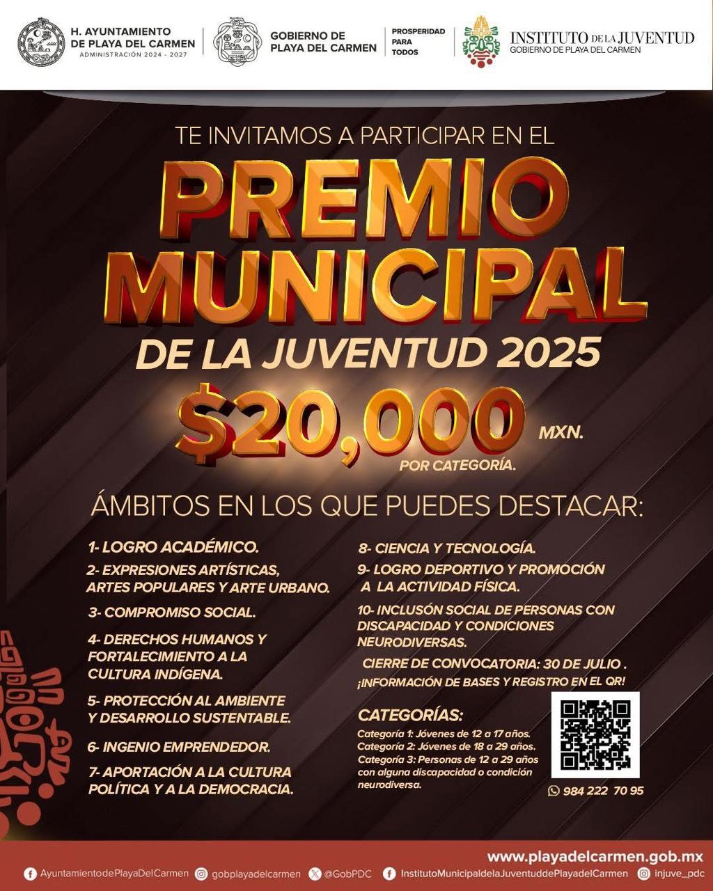 Con un estímulo económico de $20,000 pesos por categoría, lanzan convocatoria al Premio Municipal de la Juventud 2025 en Playa del Carmen.