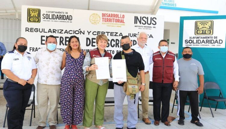 En el acto de entrega de títulos de propiedad, estuvieron el secretario general del Ayuntamiento, Alfredo Paz Cetina; el enlace municipal de Solidaridad, Alondra Jazmín Pineda Rumbo; y Andrés Ramos Jiménez, enlace en Playa del Carmen del Instituto Nacional del Suelo Sustentable (INSUS).