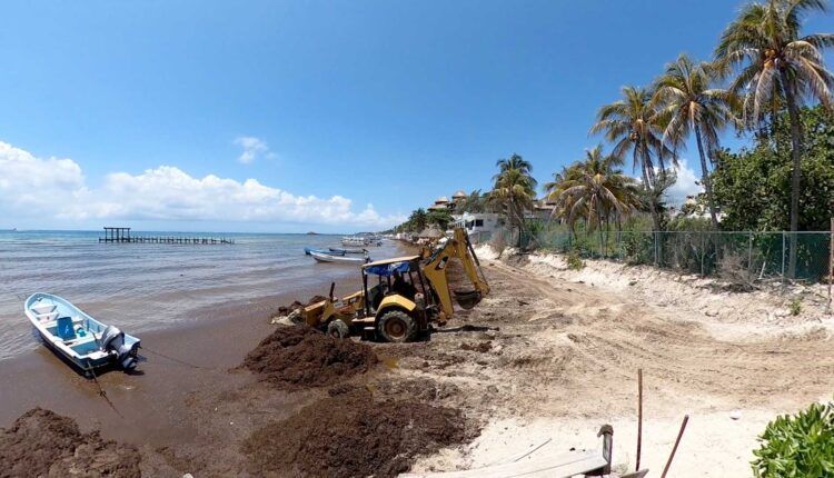 Durante horas, una pinza hidráulica y un trascabo se dieron a la tarea de recoger el alga acumulada durante estos días en que fue cerrado este punto de la zona federal marítima en Playa del Carmen.