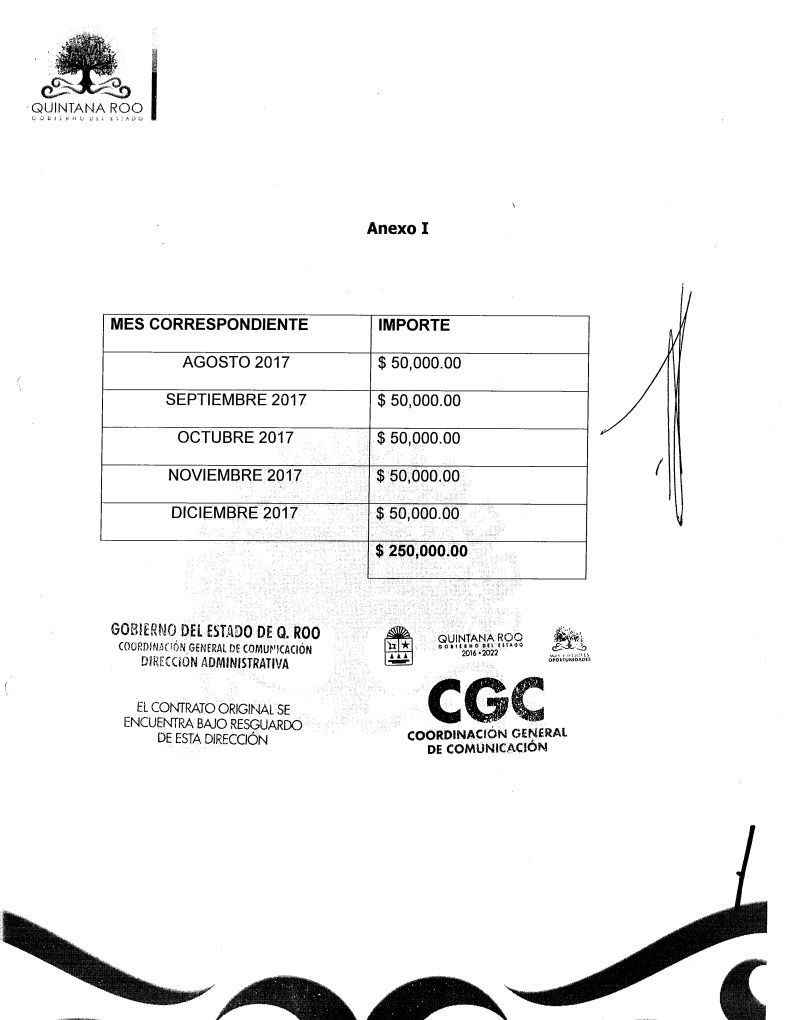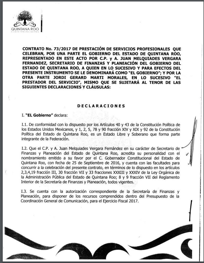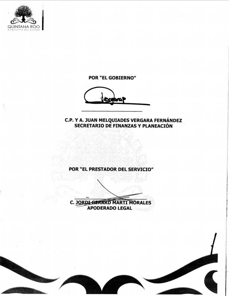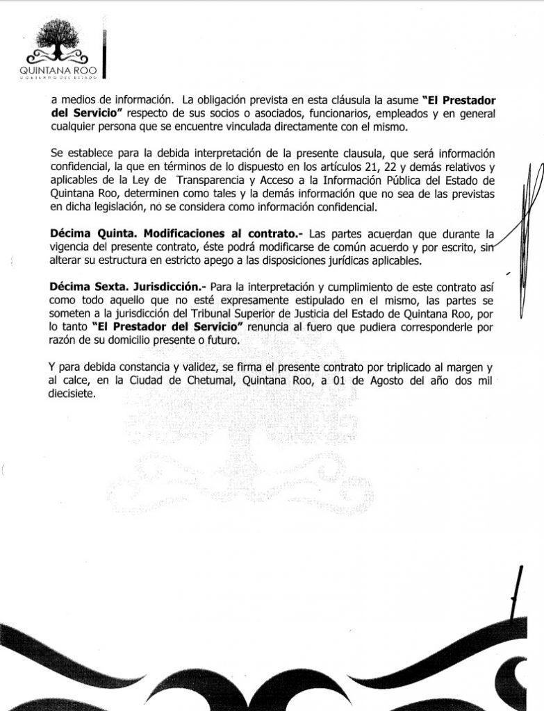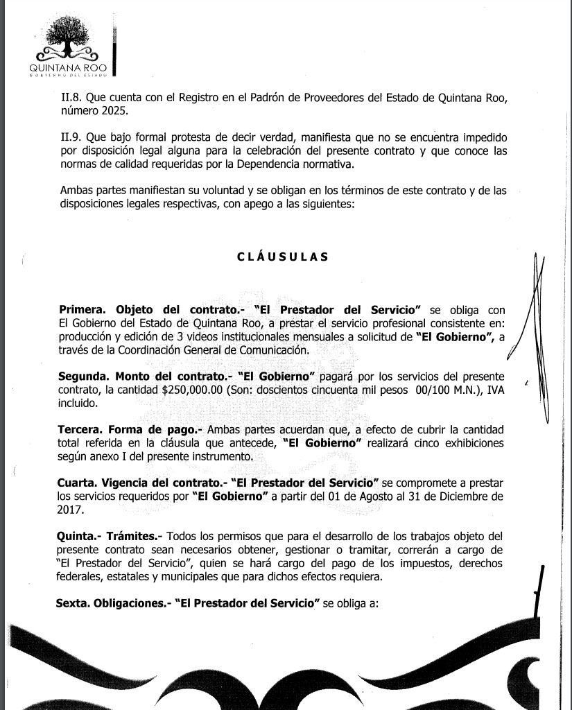 El contrato exhibido con el gobierno del Estado de Quintana Roo fue en el periodo comprendido de agosto a diciembre de 2017 y está firmado por Juan Melquiades Vergara Fernández, quien fuera secretario de finanzas y planeación en la primera parte del gobierno de Carlos Joaquín González así como el prestador de servicios, se desconoce si al momento este contrato por 50 mil pesos mensuales sigue vigente.