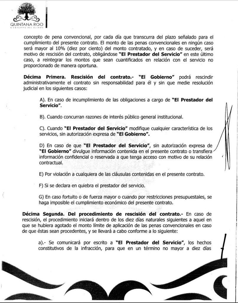 Copia del contrato publicada por la unidad de transparencia del Gobierno del Estado de Quintana Roo.