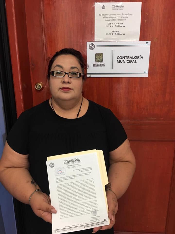 Esta mañana la Regidora Verónica Gallardo presentó ante la Contraloría Municipal de Solidaridad, una denuncia para que se investiguen los hechos relacionados con el escándalo del Servicio de Recolección de Residuos, con las empresas REDESOL y PASA y se finquen las responsabilidades correspondientes contra quien o quienes resulten responsables.