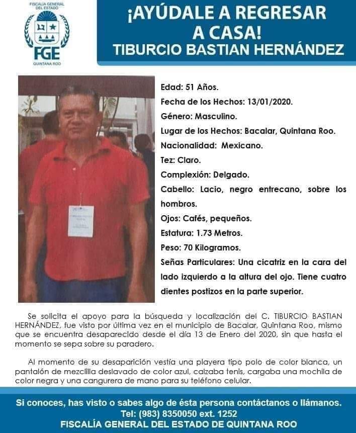 “Simple y sencillamente estamos solicitando el apoyo para que le podamos dar más continuidad a este caso del señor Tiburcio Bastian, porque como es compañero de nosotros es un personaje público, es un maestro de escuela, entonces en un lugar como Bacalar que es conocido el señor, no es posible que desaparezca sin dejar rastro, entonces es lo que solicitamos, el apoyo para solucionar esta situación”, señaló.