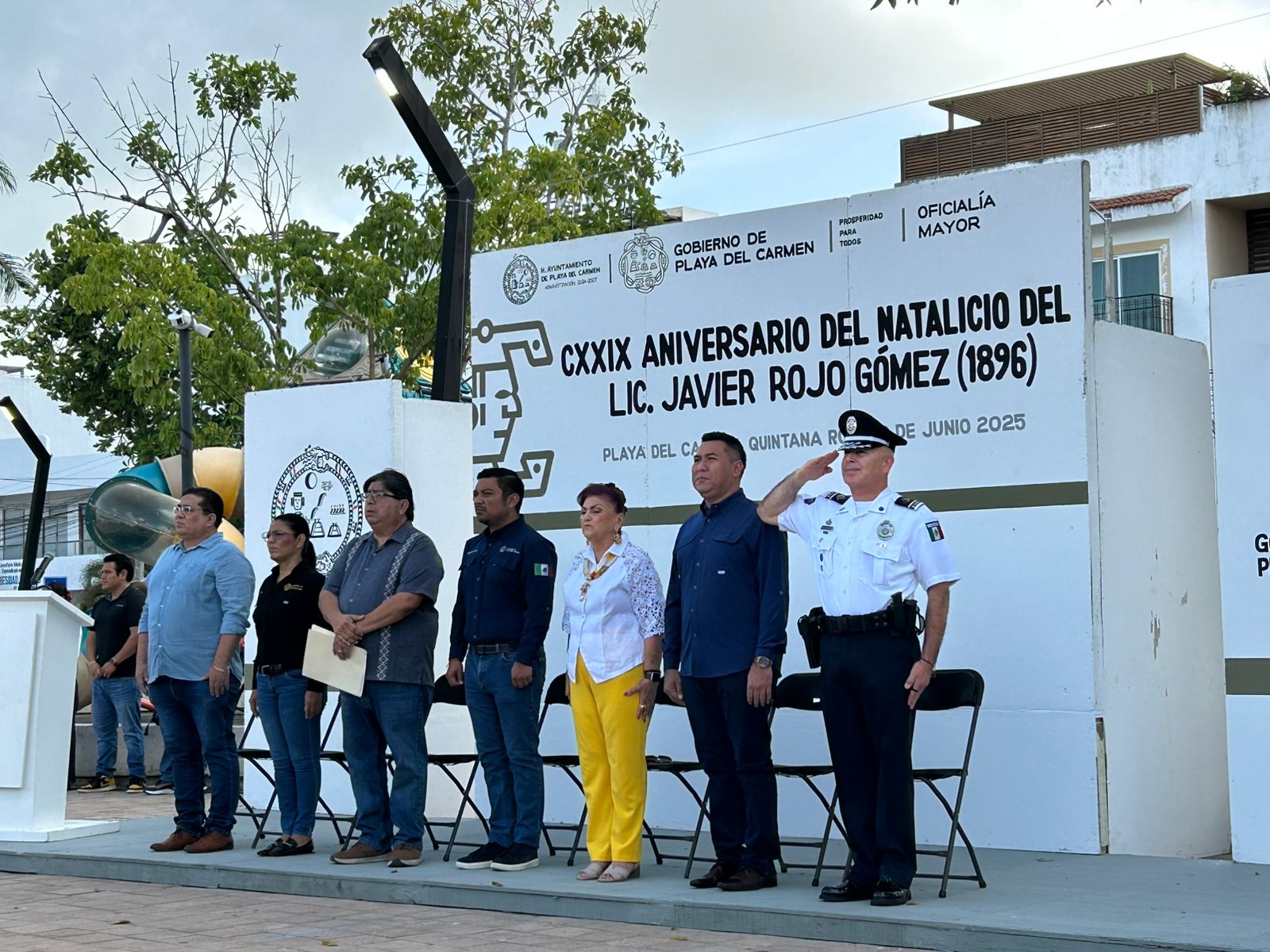 Playa del Carmen, Quintana Roo, 30 de junio de 2025.— En representación de la presidenta municipal Estefanía Mercado, el secretario general del Ayuntamiento, Luis Herrera Quiam, encabezó la ceremonia conmemorativa por el 129 aniversario del natalicio de Javier Rojo Gómez, realizada en la emblemática Plaza 28 de Julio.