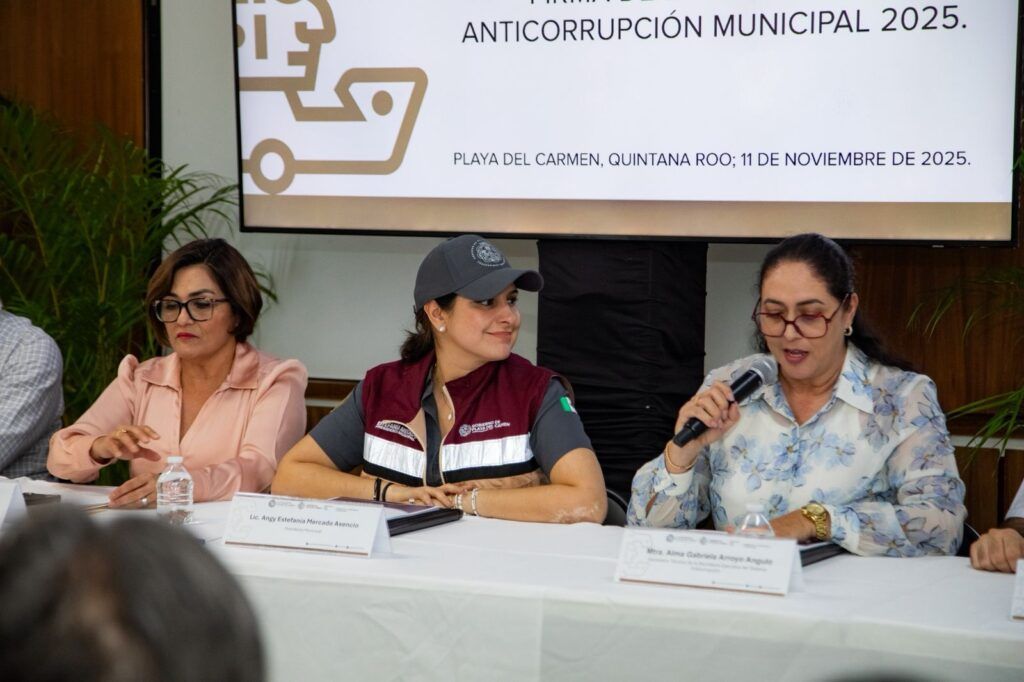 Playa del Carmen, Quintana Roo, 11 de noviembre de 2025.– La presidenta municipal Estefanía Mercado, junto con la secretaria técnica de la Secretaría Ejecutiva del Sistema Anticorrupción del Estado de Quintana Roo (Sesaeqroo), Alma Gabriela Arroyo Angulo, firmaron este martes la Estrategia Anticorrupción Municipal 2025, un acto que consolida el compromiso del gobierno municipal con la transparencia, la integridad pública y la rendición de cuentas.