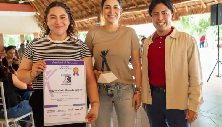 La presidenta municipal Estefanía Mercado recibió el reconocimiento en Playa del Carmen de manos Gabriel Álvarez, director de Juventud del Ayuntamiento, en compañía de la regidora Matilde Carrillo.