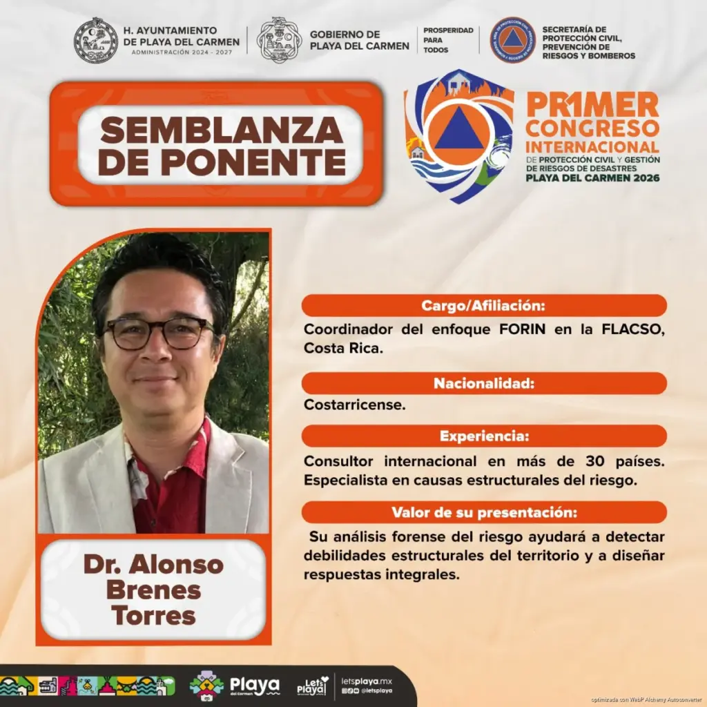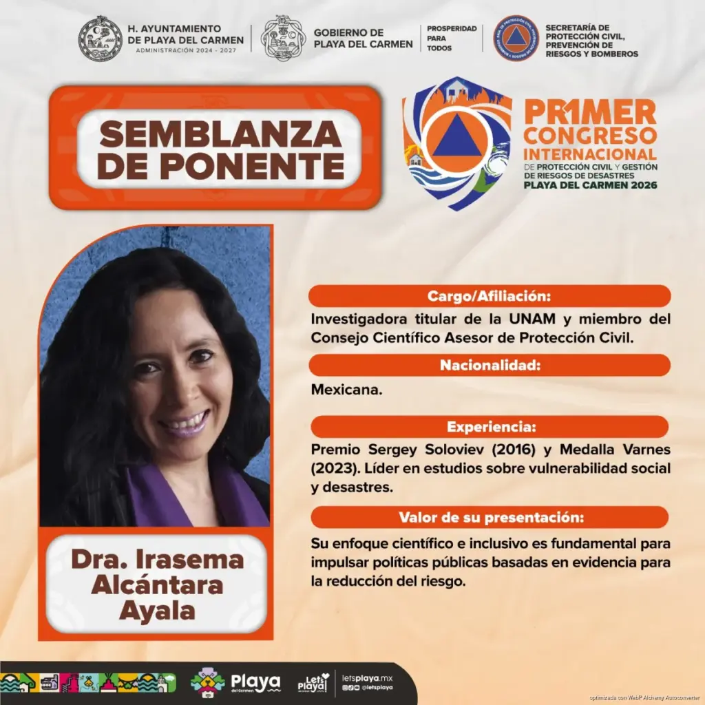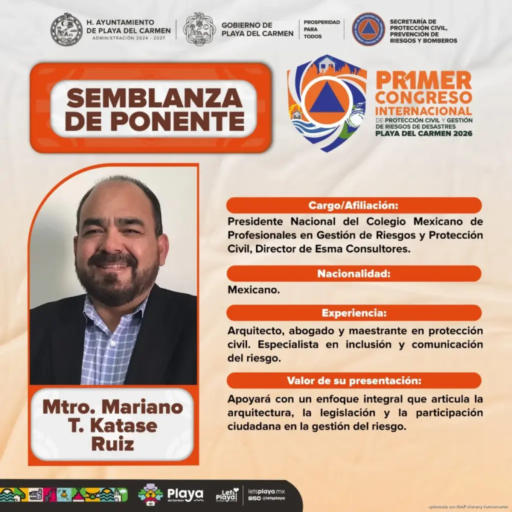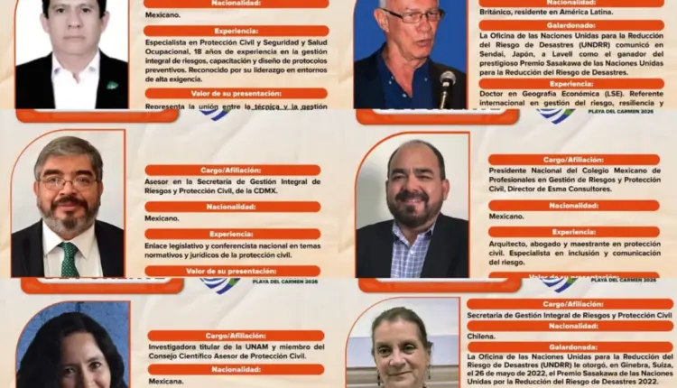 Playa del Carmen, Quintana Roo, 22 de enero de 2026.- Como parte del Primer Congreso Internacional de Protección Civil y Gestión de Riesgos de Desastres 2026, Playa del Carmen presenta a las y los 11 ponentes nacionales e internacionales que participarán en este encuentro, a realizarse del 25 al 27 de febrero.