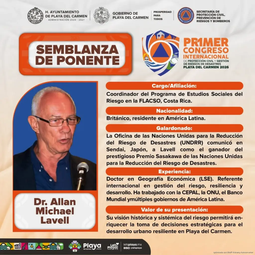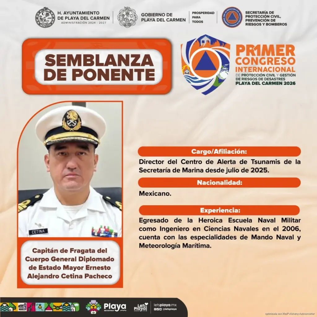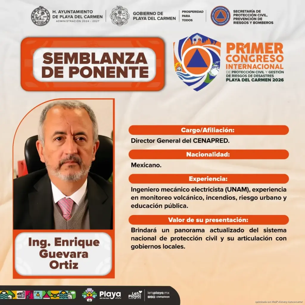 Playa del Carmen, Quintana Roo, 22 de enero de 2026.- Como parte del Primer Congreso Internacional de Protección Civil y Gestión de Riesgos de Desastres 2026, Playa del Carmen presenta a las y los 11 ponentes nacionales e internacionales que participarán en este encuentro, a realizarse del 25 al 27 de febrero.