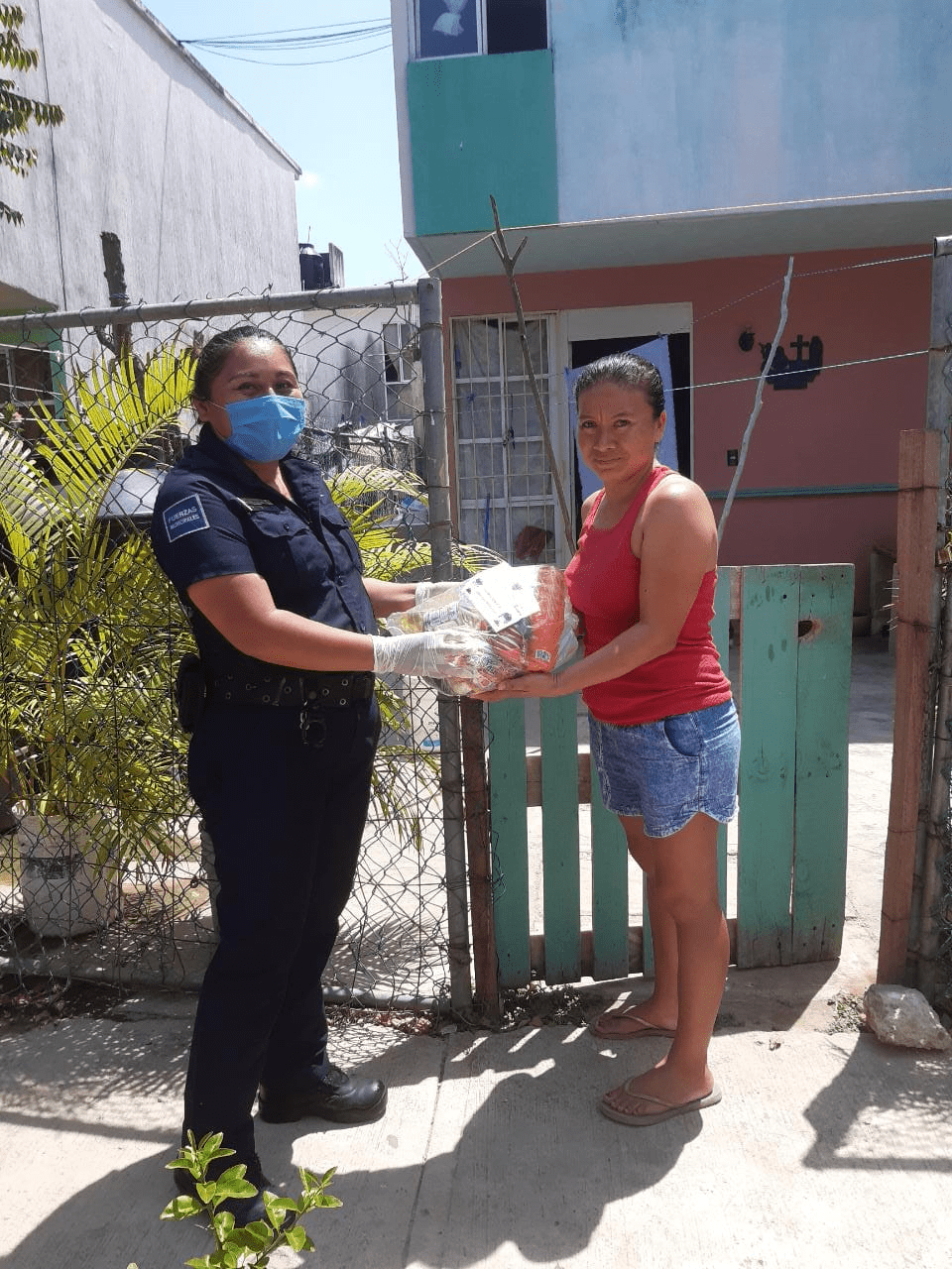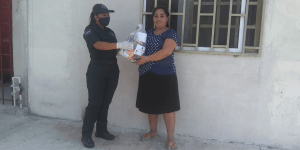 En seguimiento a la encomienda de la presidenta municipal de Solidaridad, Laura Beristain Navarrete, de apoyar a quienes más lo necesitan durante este periodo de contingencia por el COVID-19, elementos de la Secretaría de Seguridad Pública y Tránsito Municipal, encabezados por el comandante Jorge Robles Aguilar, suman esfuerzos de manera voluntaria y realizan la donación de artículos de primera necesidad y canasta básica que son entregados a las familias más vulnerables durante los recorridos de vigilancia.