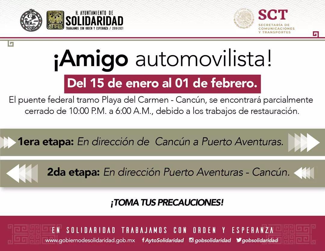 El Ayuntamiento de Solidaridad informa que del 15 de enero al 1 de febrero, permanecerá cerrado parcialmente el puente federal tramo Playa del Carmen – Cancún, esto debido a los trabajos de restauración que se están llevando a cabo.