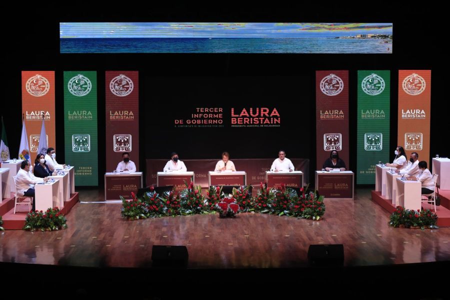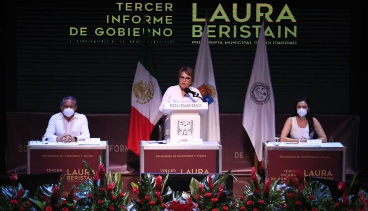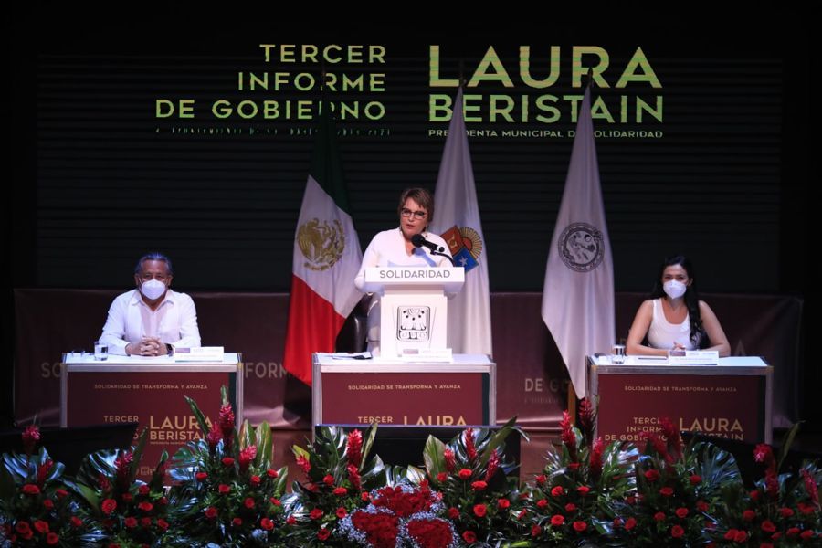 “El primer gobierno de la Cuarta Transformación en Solidaridad, ha creado cimientos promisorios, a fin de avanzar hacia un modelo de desarrollo sostenible, siguiendo el prisma de nuestra propia Agenda 2030 Local, la ruta de la justicia y el bienestar social”, destacó la presidenta Laura Beristain Navarrete al presentar su tercer informe de gobierno ante los ciudadanos solidarenses.