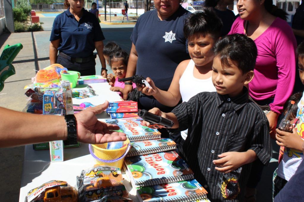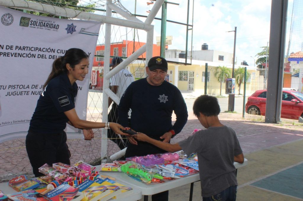 En el marco de las estrategias de prevención que promueve el gobierno de la presidenta municipal, Laura Beristain Navarrete, la Dirección General de Seguridad Pública y Tránsito de Solidaridad, a cargo del comandante Jorge Robles Aguilar, ha realizado 14 jornadas del programa “Cambia tu pistola de juguete por un juguete nuevo” mediante el cual más de 390 niños han intercambiado un juguete réplica de armamento por uno tradicional, didáctico o deportivo, con el fin de evitar patrones de conducta violentos e incentivar el sano esparcimiento y la convivencia familiar por un Solidaridad más seguro para todos.