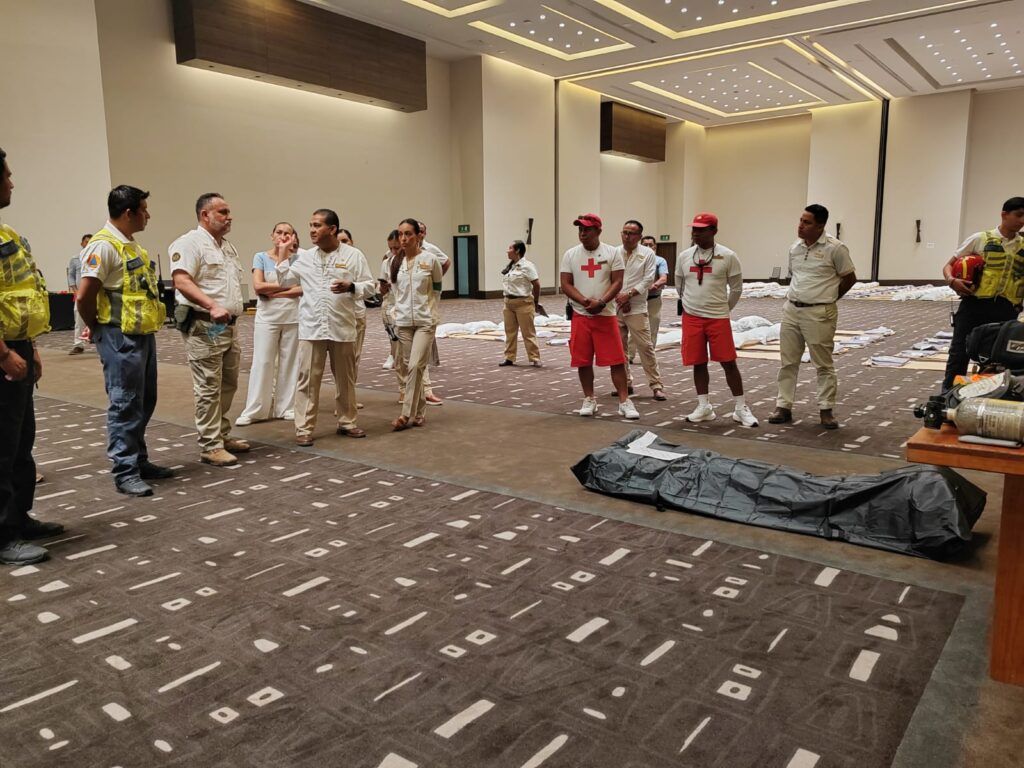 El secretario de Protección Civil, Darwin Covarrubias, explicó que la hipótesis contempló el impacto de un huracán categoría dos, lo que activó el protocolo de autorefugio, habilitando dormitorios, áreas de alimentación, equipo de protección personal y herramientas necesarias para la atención de la emergencia. También se instaló un área especial para mascotas y una zona común para la atención de huéspedes.