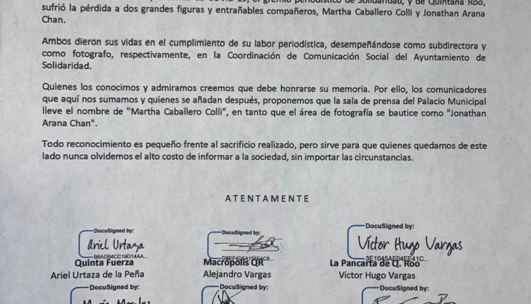 Los firmantes son: Ariel Urtaza, de Quinta Fuerza, Alejandro Vargas, de Macrópolis, Víctor Hugo Vargas, La Pancarta, Mario Morales Cruces, agencia SIM, Raúl Gamboa, Semanario Línea Roja, René Guadarrama, Capital Noticias; Eduardo De Luna, De Luna Noticias y Amir Ibrahim, de El Quintana Roo Mx.