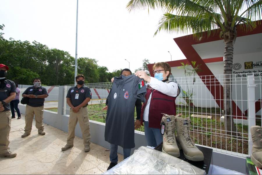 El gobierno de Solidaridad que encabeza Laura Beristain Navarrete, entregó 50 uniformes, compuestos por 200 playeras, así como 100 pantalones tácticos y 50 botas tácticas, para fortalecer la labor del personal operativo de la Secretaría de Protección Civil, Prevención de Riesgos y Bomberos
