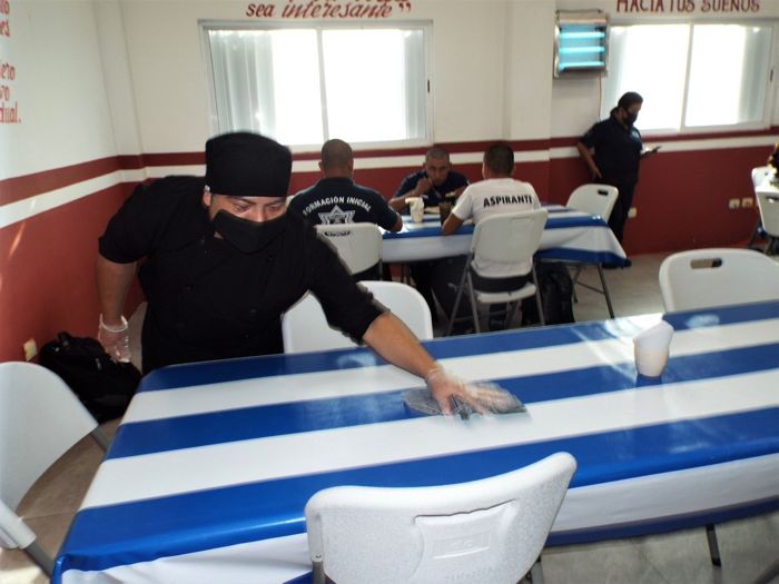 Bajo estrictas medidas de higiene y control en el comedor de la Secretaría de Seguridad Pública y Tránsito de Solidaridad se preparan alimentos para brindar el apoyo a los policías y reciban tres comidas diarias, como parte de las prestaciones laborales que el Ayuntamiento de Solidaridad brinda para asegurarse que cuenten con un estado de salud optimo para cumplir con sus labores diarias.