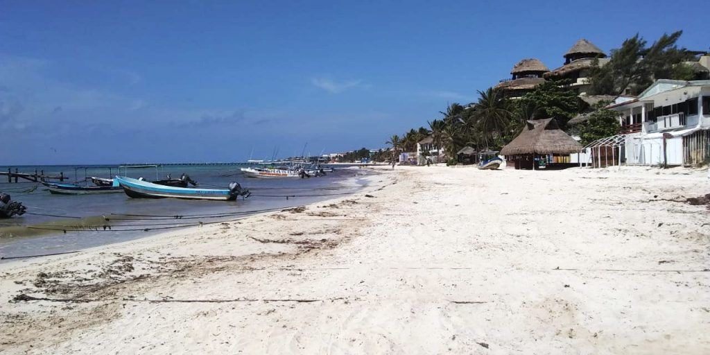 Por ser Playa Golondrinas, Playa Caribe y Playas de la Constituyentes a Playa Mamitas zona de mayor impacto por sargazo, se observa una embarcación pequeña de la Secretaría de Marina (SEMAR) recolectando sargazo con bieldos, mientras que la otra se encuentra realizando recorridos frente a la línea costera. Trabajos para los que se instalaron 2.7 kilómetros de barreras que inician del muelle fiscal hacia el norte terminando en calle 40.