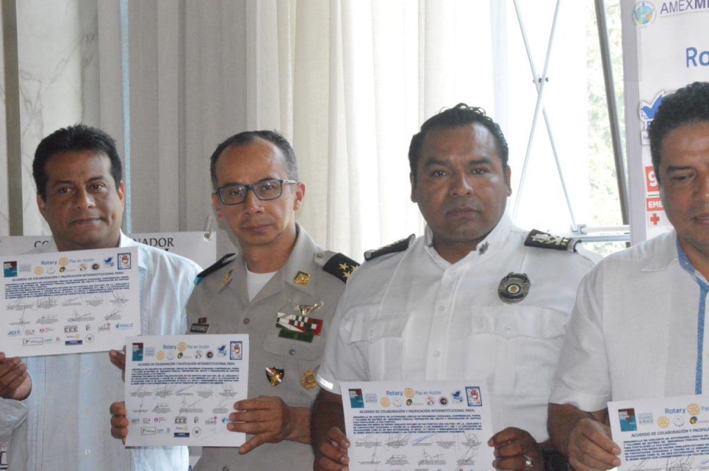 En representación de la presidente municipal, Laura Beristain Navarrete, la directora general del Instituto de las Mujeres del Municipio de Solidaridad, Mónica de la Cruz Bargas Caporali, signó este compromiso denominado: “Acuerdo de Colaboración y Pacificación Interinstitucional”, que forma parte del programa “Vecino Vigilante por la Paz”, que promueve la asociación civil Rotary Internacional.
