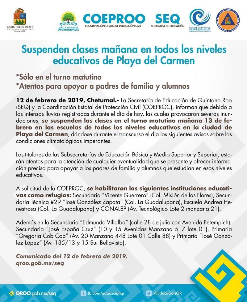 informa que debido a las intensas lluvias registradas durante este martes 12 de febrero, las cuales provocaron severas inundaciones se suspenden las clases en el turno matutino de hoy 13 de febrero en las escuelas de todos los niveles educativos en Playa del Carmen, dándose durante el transcurso del día los siguientes avisos sobre las condiciones climatológicas imperantes.