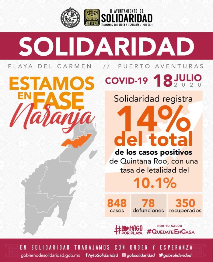 Solidaridad sigue en semáforo naranja al mantener estable la curva de contagios al tener solo el 14% de casos confirmados en el estado; una tasa de letalidad del 10.1%, una recuperación de 89.9% y un 45% en ocupación hospitalaria. Sin embargo, sólo con la participación responsable de los solidarenses, evitaremos la propagación del virus.