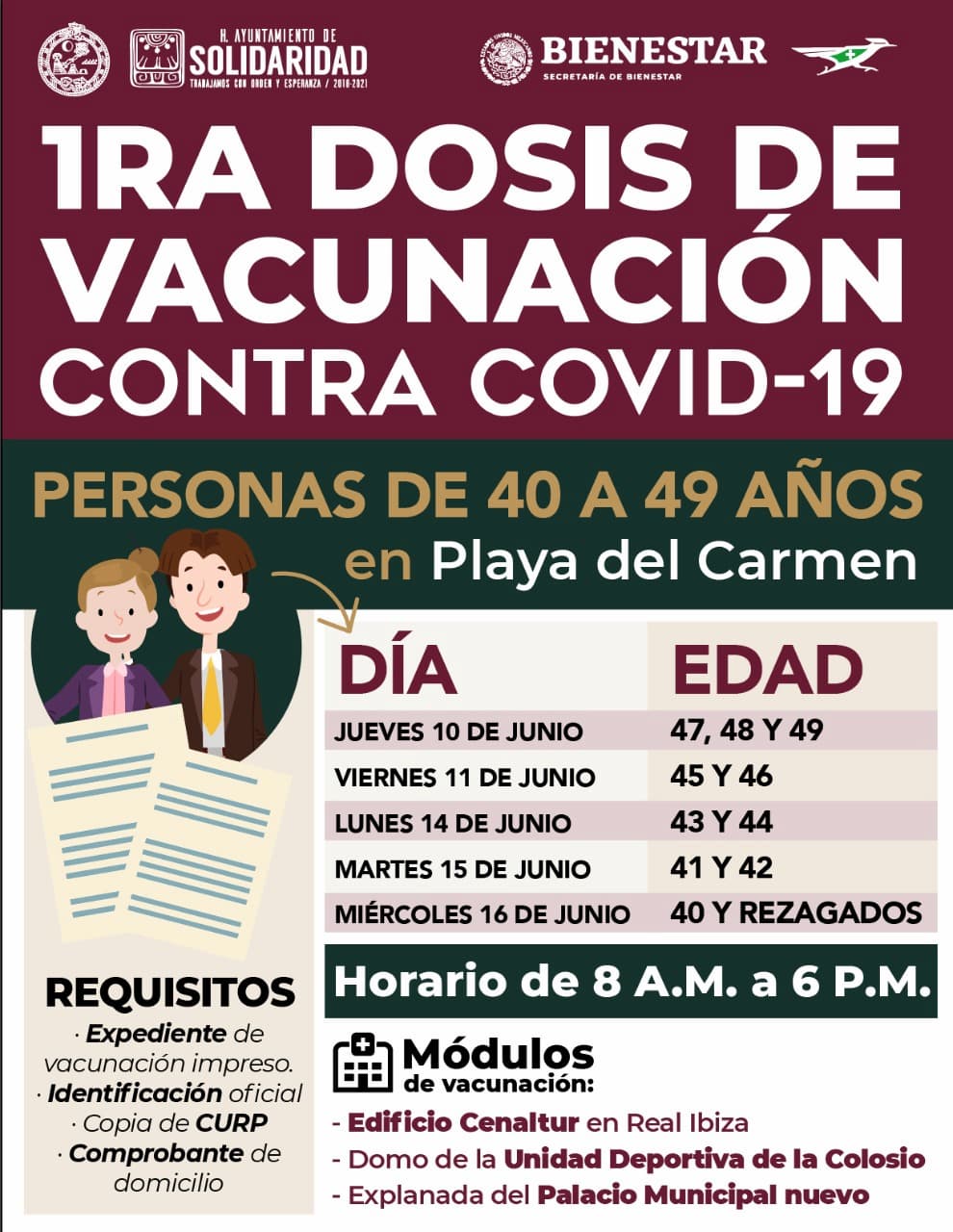 Los puestos de vacunación se encuentran ubicados en el CENALTUR (Real Ibiza), el domo de la Unidad Deportiva Luis Donaldo Colosio y en la explanada del Nuevo Palacio Municipal, en horario de 08:00 a 18:00 horas. El lunes serán vacunadas las personas de 44 y 43 años, el martes las de 42 a 41, y el miércoles las de 40 años, así como las personas rezagadas. En el caso de las mujeres embarazadas mayores de 18 años y con 9 semanas de gestación, pueden hacerlo en cualquiera de esas fechas.