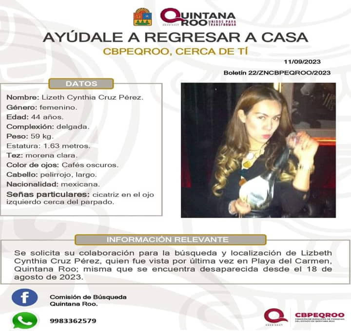 Para cualquier información dirigirse a la página de Facebook de la Comisión de Búsqueda de Quintana Roo o al WhatsApp 9983362579.