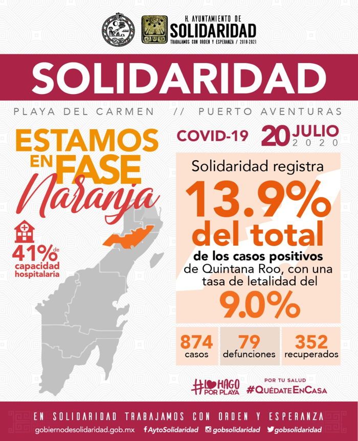 Continúa el municipio en color naranja al mantener estable la curva de personas contagiadas. De acuerdo al reporte del día de hoy de la Secretaría de Salud estatal, Solidaridad representa el 13.9% de casos confirmados en el estado, una tasa de letalidad del 9%, recuperación de 40.27% y 41% en ocupación hospitalaria.
