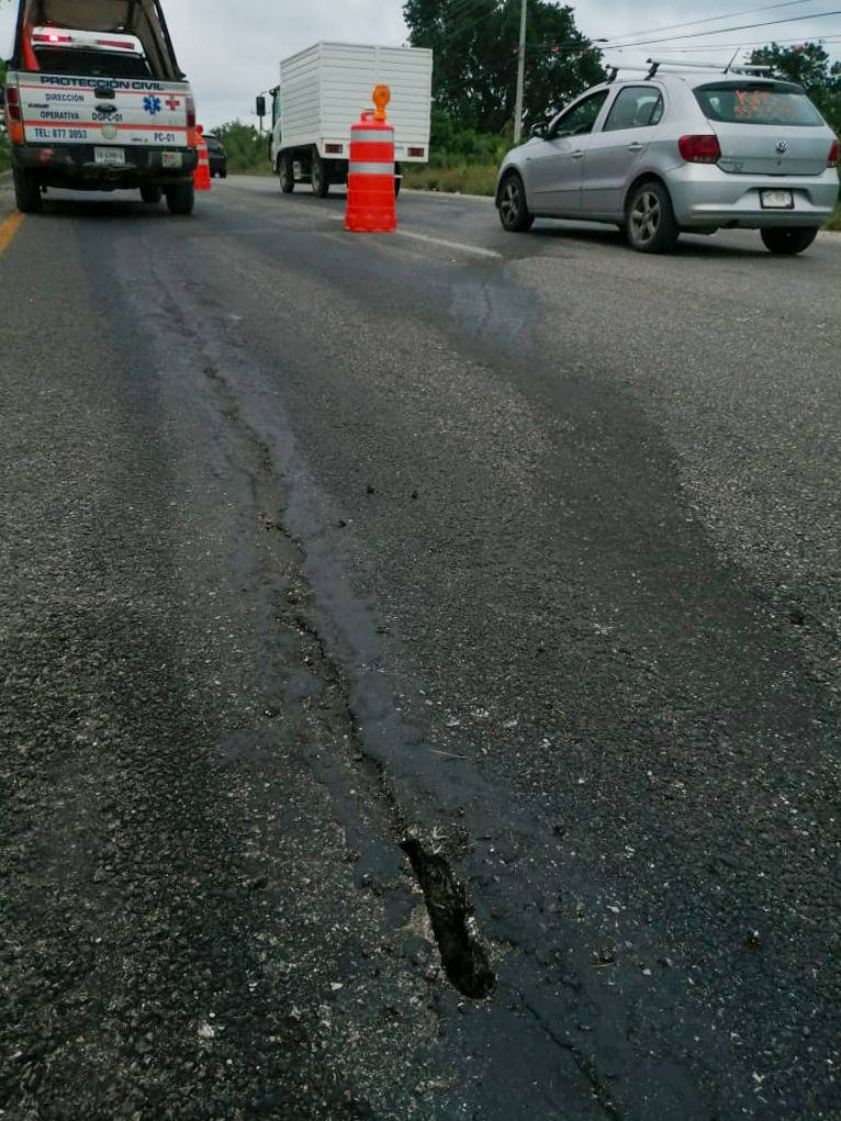 La directora operativa de Protección Civil de Solidaridad, Leticia Hernández, informó que en el lugar se observó una grieta sobre la carpeta asfáltica que cruza del carril de baja de norte a sur hasta el carril de baja de sur a norte, pasando por el carril central, misma que tiene una profundidad de aproximadamente 25 cm.