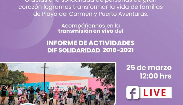 La transmisión de este informe se hará en vivo este jueves 25 de marzo a las 12 del día, a través de las redes oficiales del Sistema: DIF Solidaridad (Facebook); DifSolidaridad1 (Twitter) y @difsolidaridad (Instagram); lo anterior para cuidar la salud de los solidarenses al evitar concentración de personas y prevenir contagios por el COVID-19.